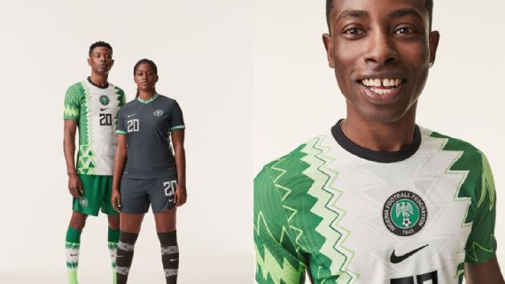 The home kit uses the traditional aesthetic of an agbada robe for inspiration, using another hand-drawn pattern that is symbolic of the country’s heritage, with nods to nobility and family. Eagle feathers can be seen in players’ names and numbers, and that pattern is incorporated into Nigeria’s away kit as well.