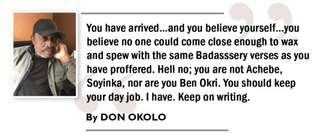 And just when the rewrite is fine and looking as dandy as ever, that is when you should really, really rewrite that baby. Clarity begins to set in…and you experience the initial burst of euphoria inside a toothed grin. You have arrived…and you believe yourself…you believe no one could come close enough to wax and spew with the same Badasssery verses as you have proffered. Hell no; you are not Achebe, Soyinka, nor are you Ben Okri. You should keep your day job. I have. Keep on writing.