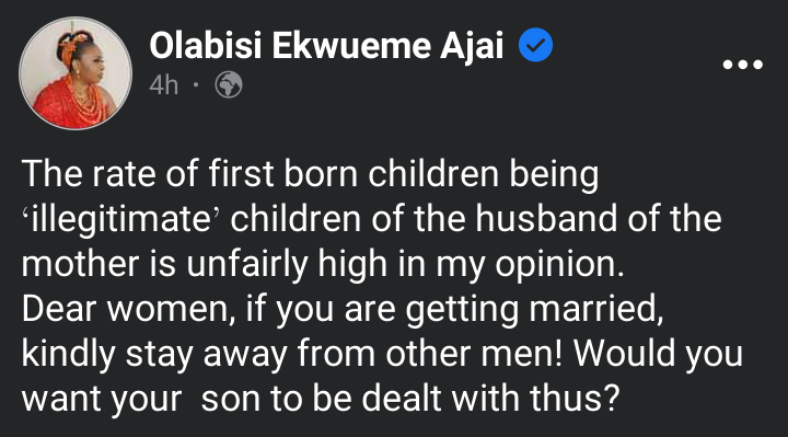 Taking to her Facebook page, the UK-based Nigerian raised alarm over the rate at which some women who are engaged to be married still sleep with their ex-lovers; thereby, giving birth to first-born children who turn out to be illegitimate children of their husbands.