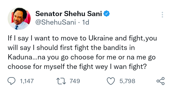 Human rights activist and politician, Senator Shehu Sani has made a satirical statement that seems to be mocking the Nigerian government over its interest in the Russian-Ukraine crisis while bandits are ravaging lives and property in Northern Nigeria.