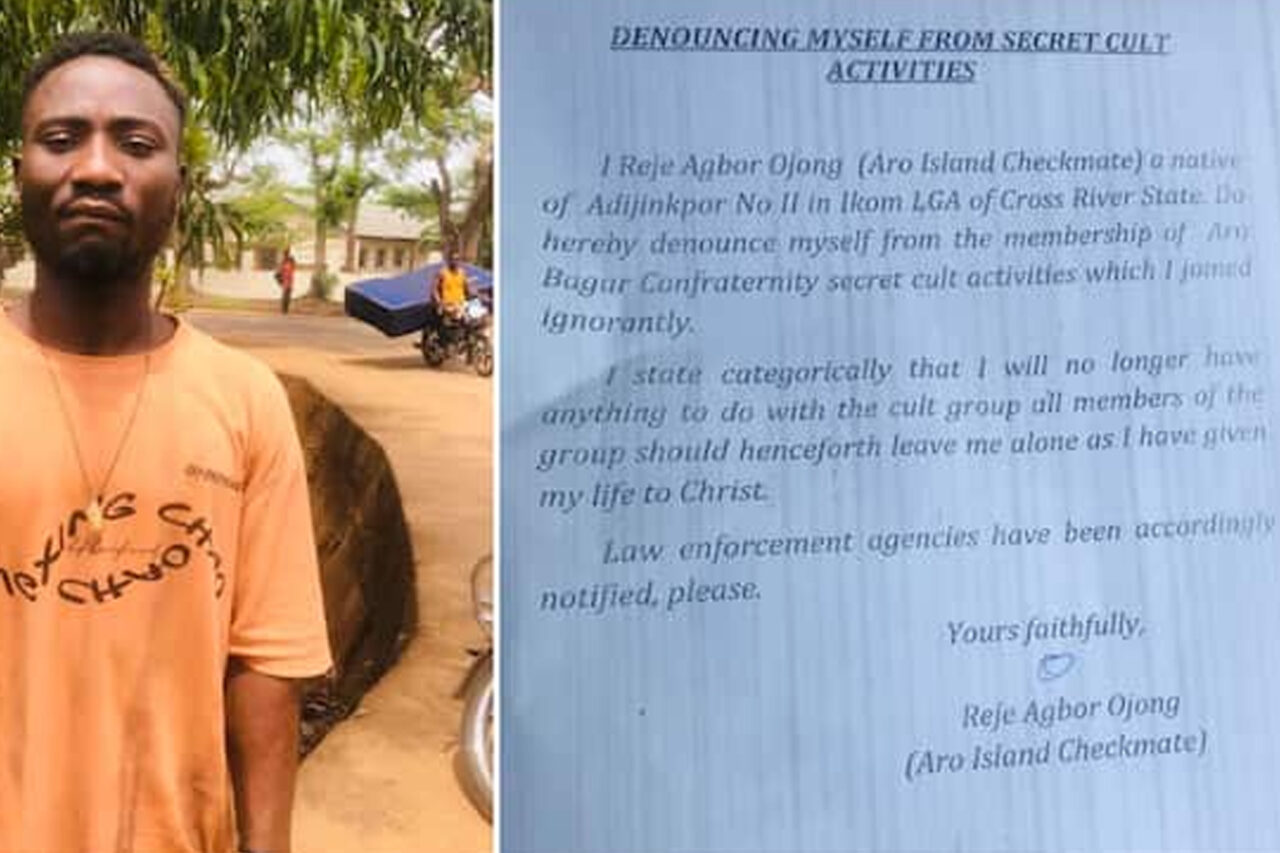A young Nigerian man, Reje Agbor Ojong has openly denounced his membership of the Aro Bagar Confraternity secret cult group.