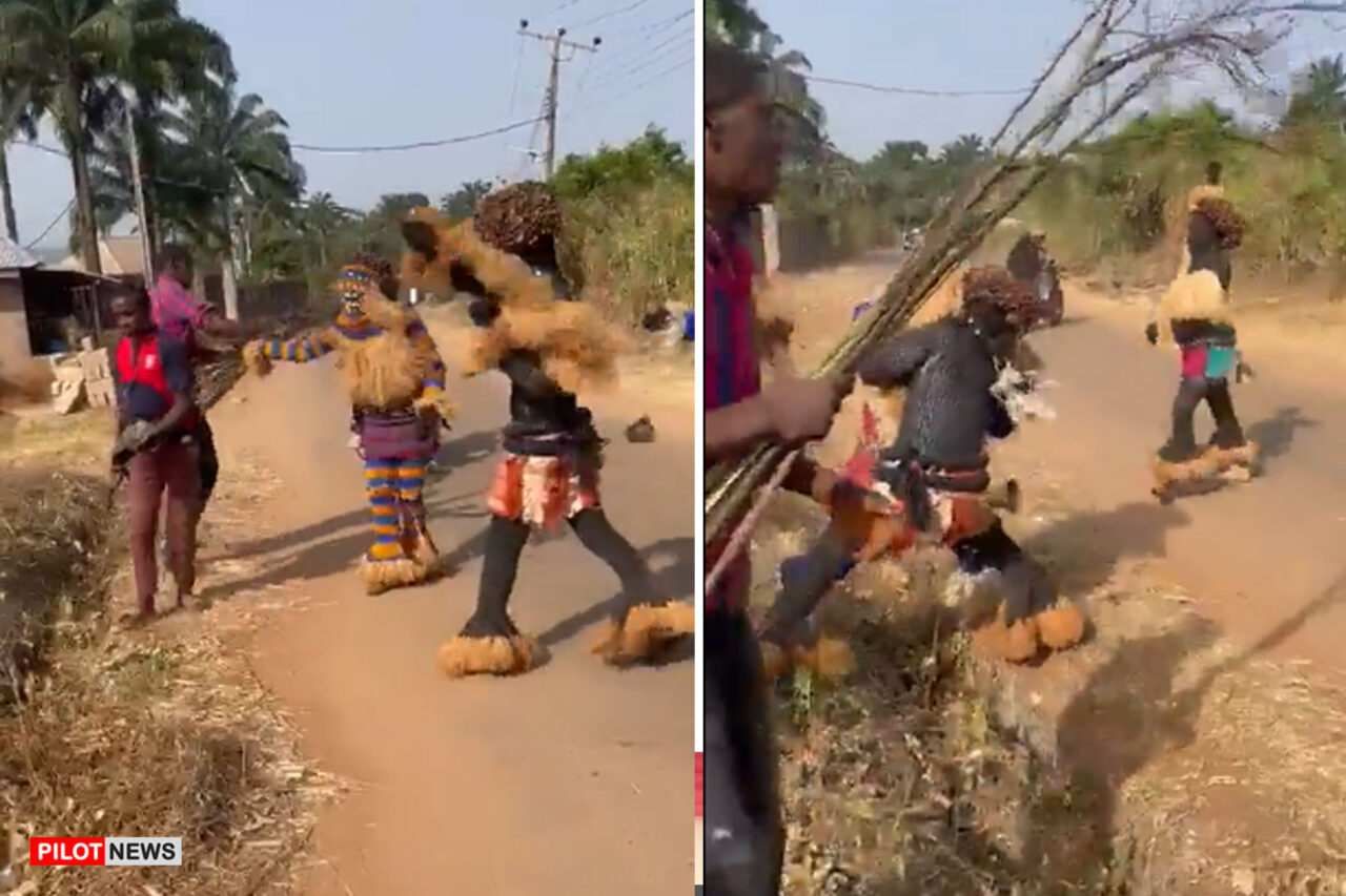 In the video shared by Pulse Nigeria, two rival masquerade groups ran into each other on the road and a fierce fight ensued between them.