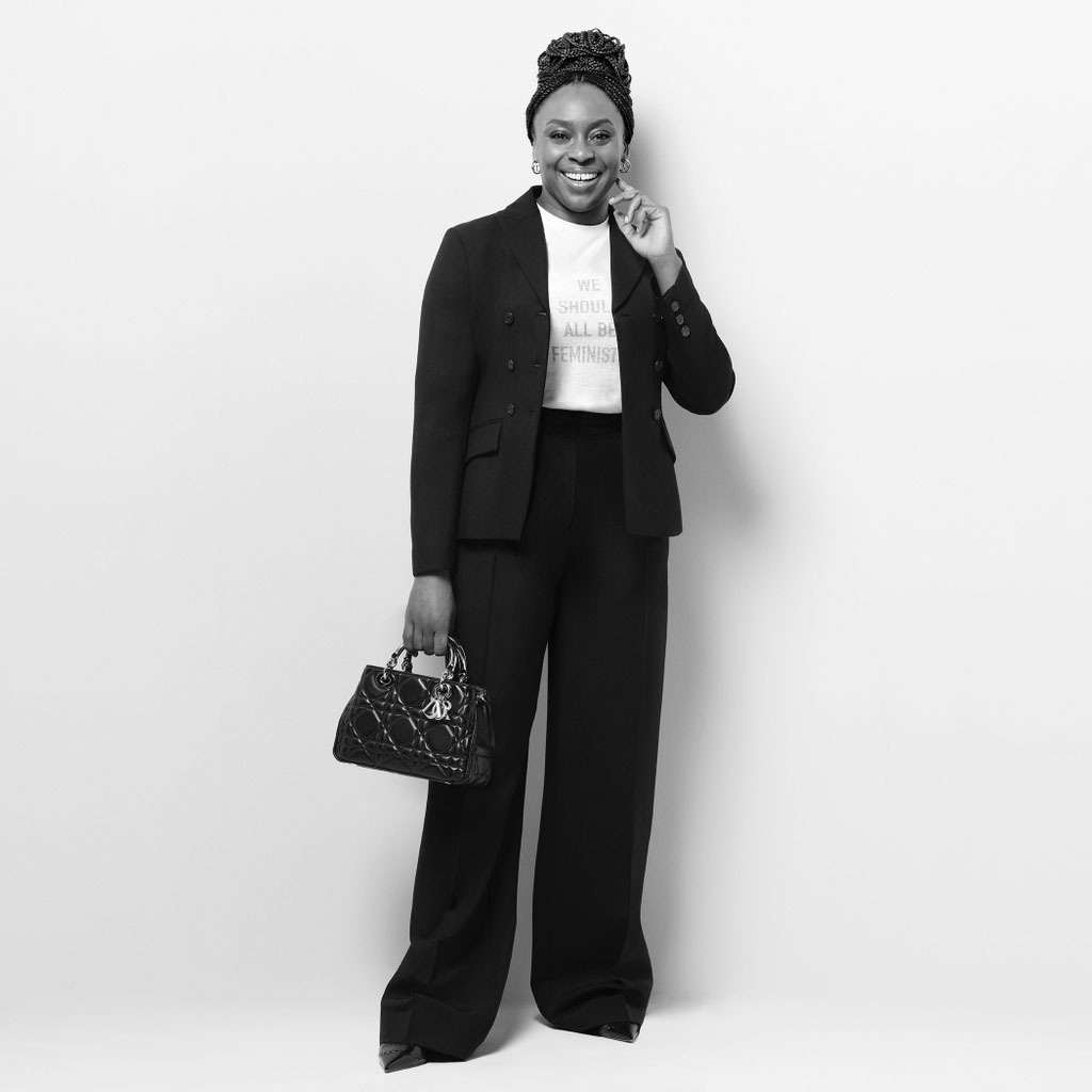 For the ad, Adichie wears a black pantsuit and a white t-shirt with the words ‘We Should All Be Feminists’.