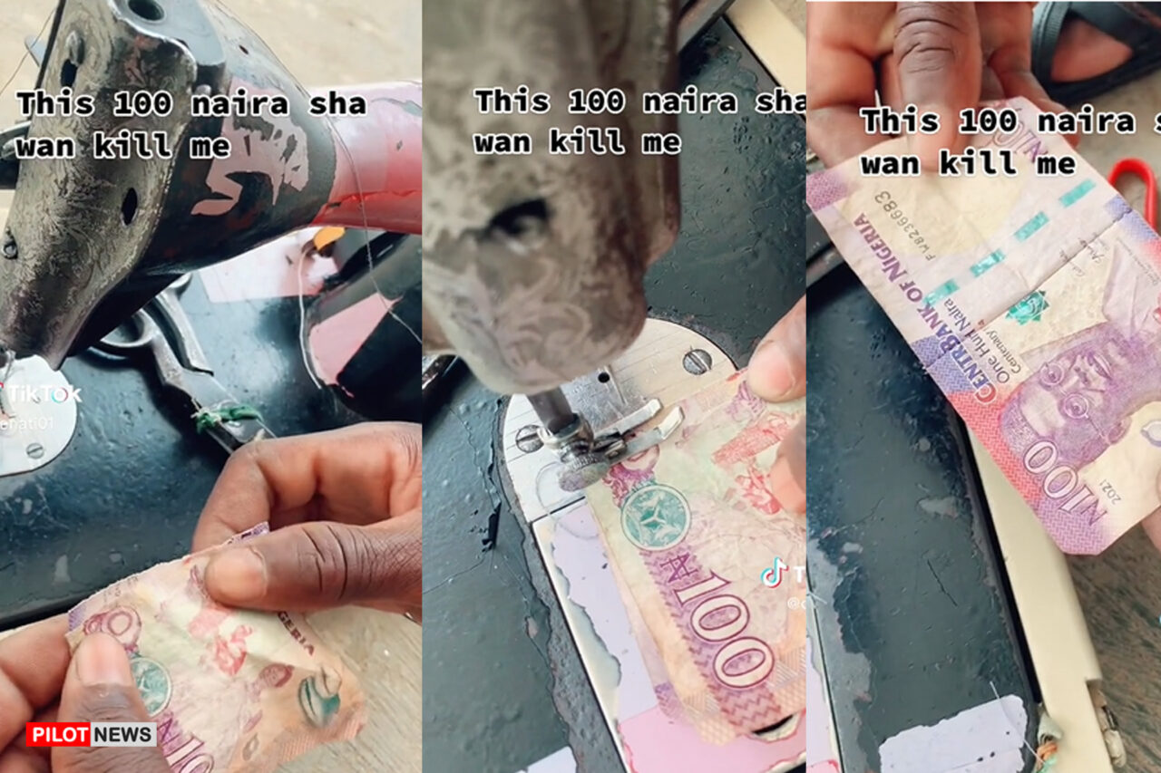 A video posted on TikTok has shown a Nigerian lady using a sewing machine to stitch a torn N100 note.