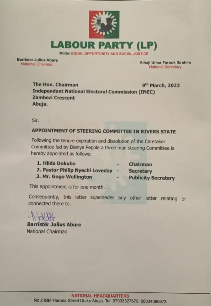 Barrister Julius Abure, national chairman of the LP, announced the appointment in a letter addressed to the Independent National Electoral Commission (INEC) on Thursday.