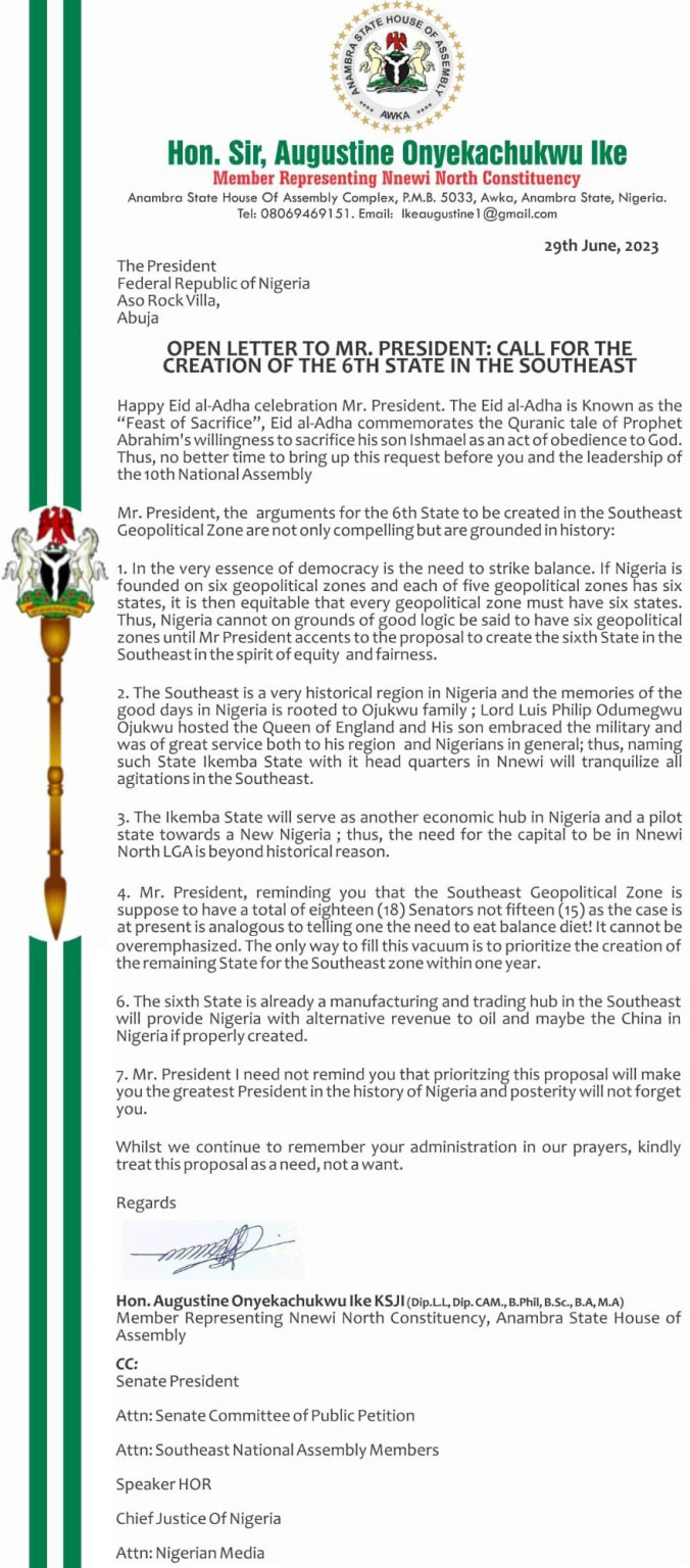 Hon. Augustine Onyekachukwu Ike, the member representing Nnewi North Constituency in the Anambra State House of Assembly, has called on President Bola Tinubu and the leadership of the 10th National Assembly to create a sixth state in the southeast geopolitical zone within one year.