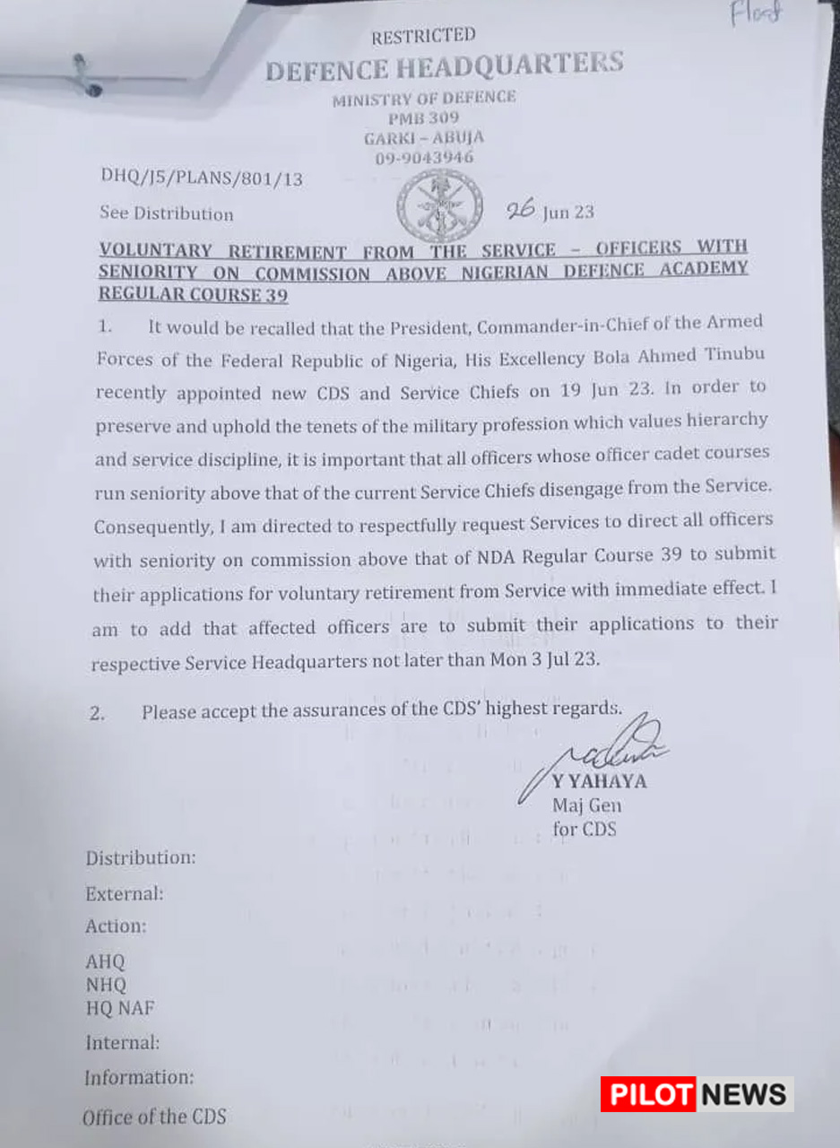 The order was contained in a memo signed by Major General Y. Yahaya on behalf of the Chief of Defence Staff, ordering all officers above that of NDA Regular Course 39 to submit their applications for voluntary retirement from Service with immediate effect.