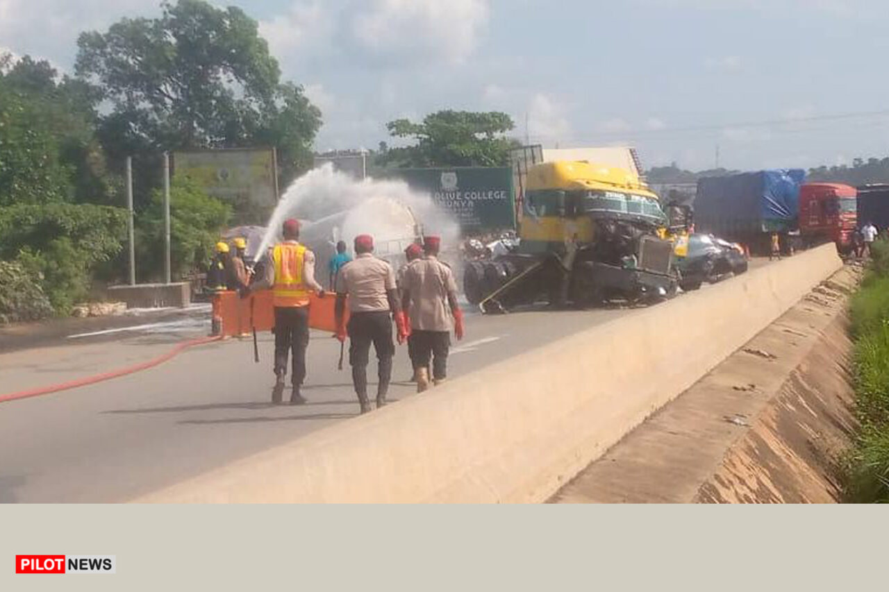 The accident involved two trailer trucks, one Jetta Sienna bus, one black Toyota car, all of which were badly damaged the accident was said to have occurred as a result of over-speeding.