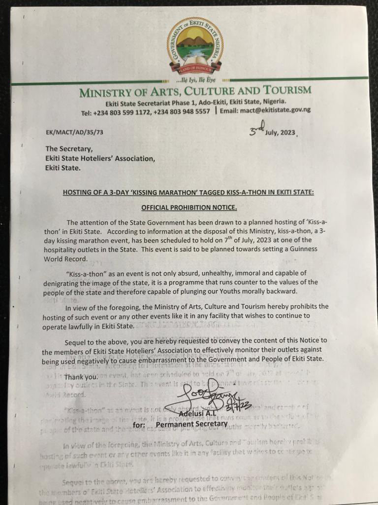 The Ekiti State Government has issued a notice prohibiting the organisers of a proposed kiss-a-thon in Ado-Ekiti, the State capital, from going ahead with the ‘immoral’ event.