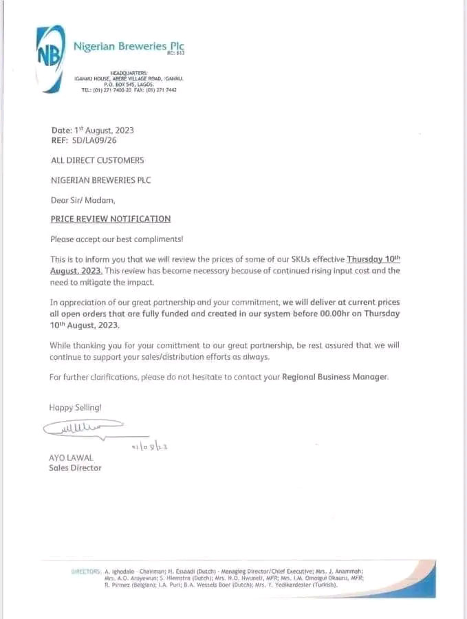 NB announced the upward price review of its products via a memo to customers by the company’s sales director, Ayo Lawal on Tuesday, August 1.