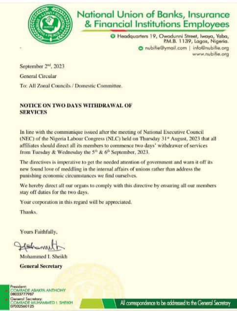 The National Union of Banks, Insurance and Financial Institution Employees, NUBIFIE, has issued a directive to banks and other financial institutions to stay off duty on Tuesday and Wednesday.