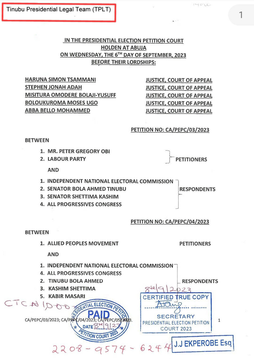 Following the court’s acknowledgment of President Bola Tinubu’s victory on September 6, the certified true copies of the judgment were released to the petitioners: Peter Obi and his party, Labour Party; Atiku Abubakar and his party, the Peoples Democratic Party and the Allied Peoples Movement, and the respondents: the Independent National Electoral Commission (INEC) and President Tinubu and his party, the All Progressives Congress last Friday.