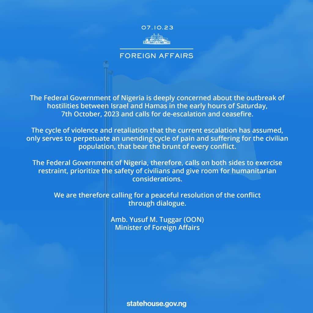 The Nigerian government has, tongue-in-cheek, called for a peaceful resolution of the conflict between Israel and Palestine, a few hours after a war broke out on Israeli soil.