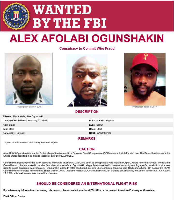 Ogunshakin is alleged to have participated in a business email compromise, BEC, scheme from January 2015 to September 2016.