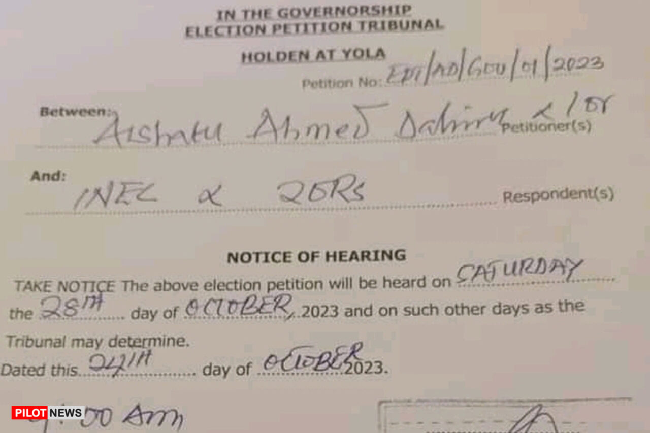The Governorship Election Petition Tribunal (GEPT) will on Saturday, October 28, 202,3 deliver judgment on the petition filed before it by the APC Governorship candidate in the 2023 elections in Adamawa state, Sen. Aishatu Ahmed Dahiru Binani against INEC, PDP, and Governor Fintiri of PDP.