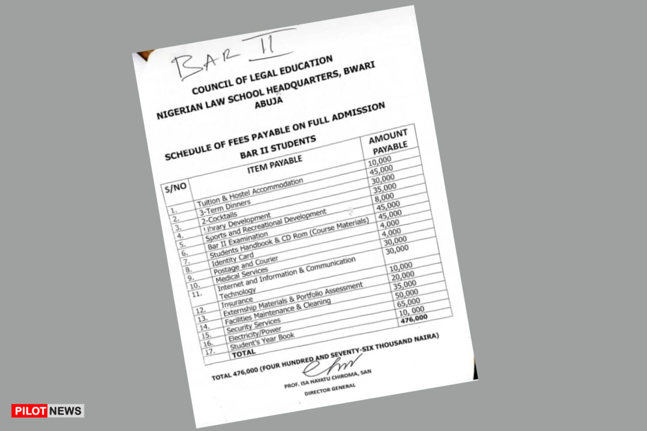 The memo on the revised fee was signed by the director-general of the Nigerian Law School Headquarters in Bwari, Abuja, Professor Isa Hayatu Chiroma.