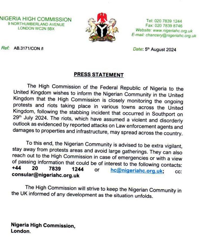 The Ministry warned Nigerians planning to visit the UK that “demonstrations by far-right and other extra-parliamentary groups in parts of the UK in recent weeks have been large and in some instances unruly” and that “there is an increased risk of violence and disorder.”