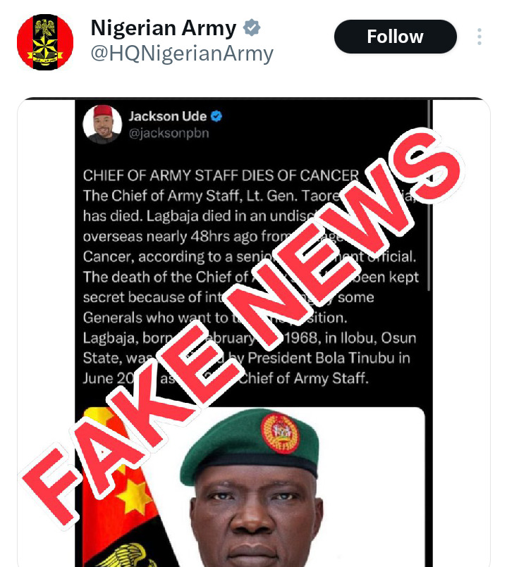 His post on Sunday reads: “The Chief of Army Staff, Lt. Gen. Taoreed Lagbaja, has died. Lagbaja died in an undisclosed hospital overseas nearly 48 hrs ago from a stage three cancer, according to a senior government official. The death of the Chief of Army staff has been kept secret because of intense lobbying by some Generals who want to take the position.”