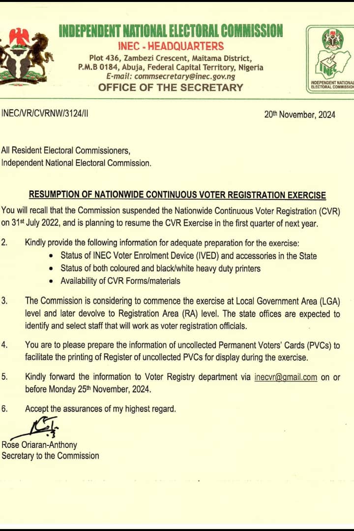The resumption of the exercise was contained in a memo by the electoral body signed by the Independent National Electoral Commission, INEC Secretary, Rose Oriaran-Anthony, dated November 20, 2024, to all Resident Electoral Commissioners.