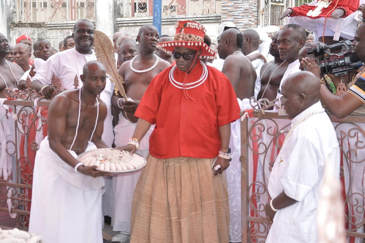 The display of Akọ, a human effigy, symbolizing the departed royal Matriarch preceded by Oba Ewuare II, who led the pack in a procession from his Palace to the sacred Emotan deity at the King square in Benin City where he offered prayers for the repose of the soul of Queen mother, Iyoba Omo N’ikuoyemwen, Iyoba Ewuare II.