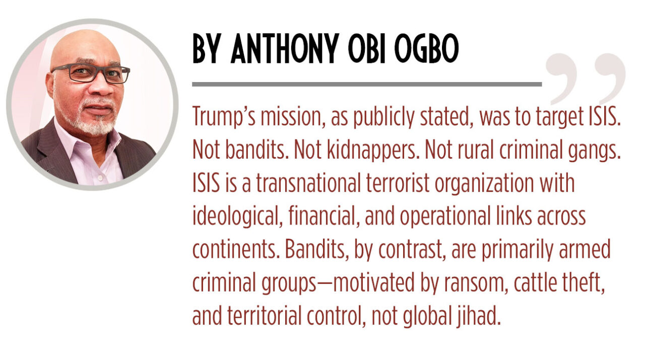 Trump’s mission, as publicly stated, was to target ISIS. Not bandits. Not kidnappers. Not rural criminal gangs. ISIS is a transnational terrorist organization with ideological, financial, and operational links across continents. Bandits, by contrast, are primarily armed criminal groups—motivated by ransom, cattle theft, and territorial control, not global jihad. Conflating the two may be politically convenient, but it is analytically dishonest.